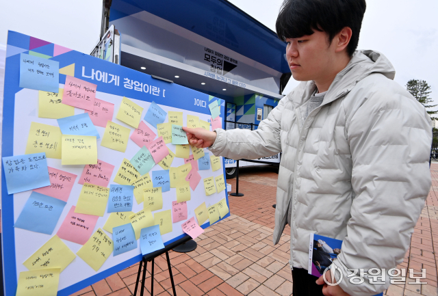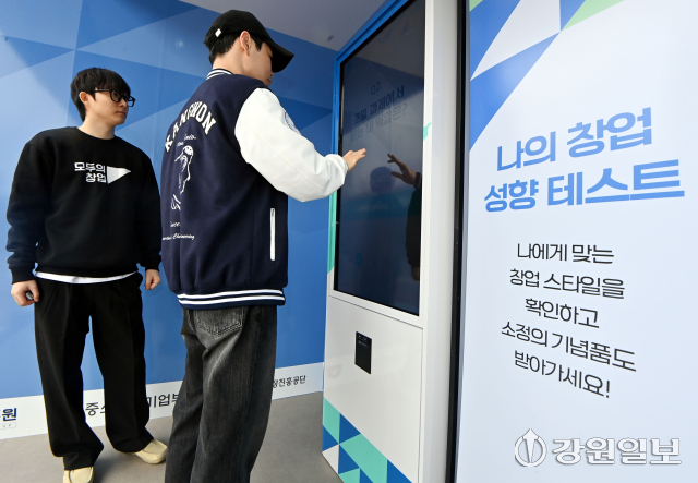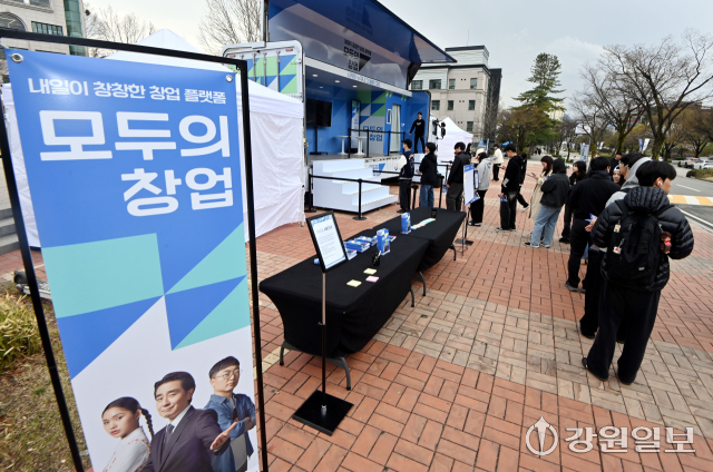 중소벤처기업부가 청년과 대학생들의 창업을 지원하기 위한 ‘모두의 창업 프로젝트’를 추진하고 있는 가운데 6일 강원대 춘천캠퍼스에서 '모두의 창업 캠퍼스 투어' 행사가 열려 학생들이 창업 성향 테스트 등 다양한 이벤트에 참여하고 있다.