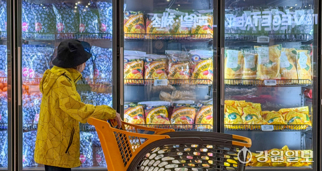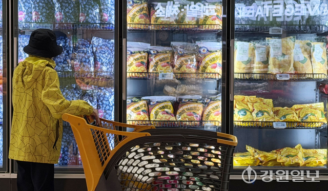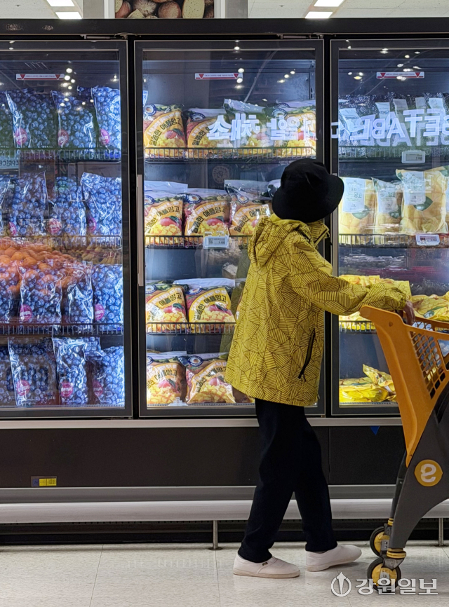 미국-이란전쟁으로 인한 고환율 여파로 수입 과일가격이 오르고 있는 가운데 비교적 단기 환율 영향이 적은 냉동과일 상품이 대체품으로 관심을 받고 있다. 6일 도내 한 대형마트에서 시민이 냉동과일을 살펴보고 있다.