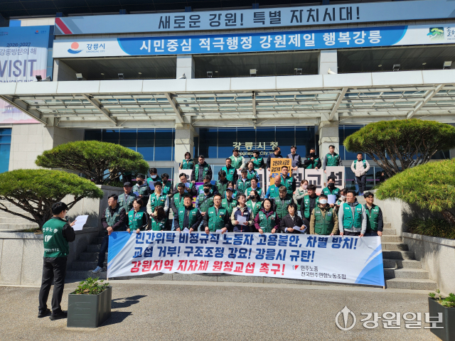 【강릉】민주노총 전국민주연합노동조합은 7일 강릉시청 앞에서 기자회견을 열고 도내 지자체들이 민간위탁 노동자들과 직접 교섭할 것을 촉구했다.