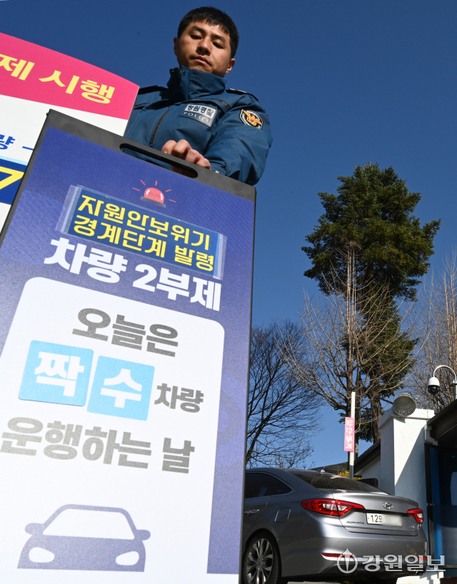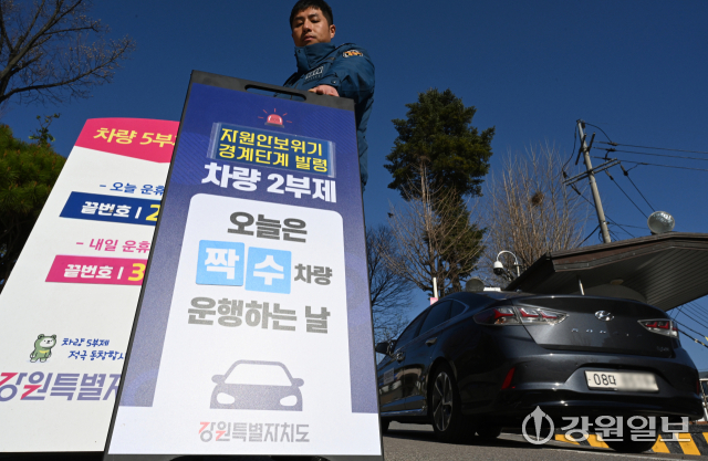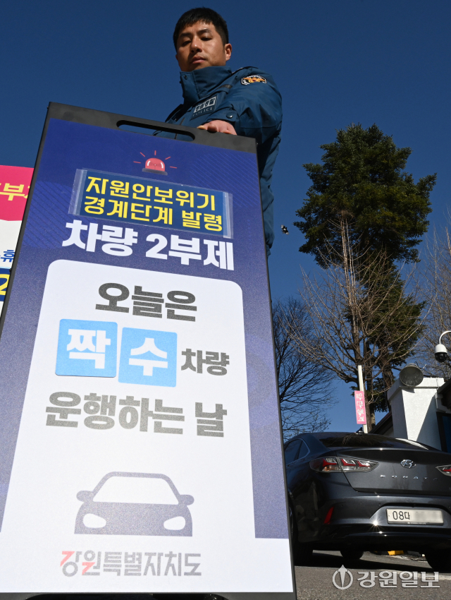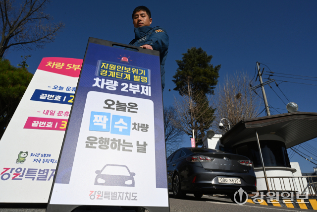 공공기관 차량 2부제 시행을 하루 앞둔 7일 강원특별자치도청 진입로에 직원들이 2부제 시행 안내문 설치를 준비하고 있다. 박승선기자공공기관 차량 2부제 시행을 하루 앞둔 7일 강원특별자치도청 진입로에 직원들이 2부제 시행 안내문 설치를 준비하고 있다. 박승선기자공공기관 차량 2부제 시행을 하루 앞둔 7일 강원특별자치도청 진입로에 직원들이 2부제 시행 안내문 설치를 준비하고 있다. 박승선기자공공기관 차량 2부제 시행을 하루 앞둔 7일 강원특별자치도청 진입로에 직원들이 2부제 시행 안내문 설치를 준비하고 있다. 박승선기자