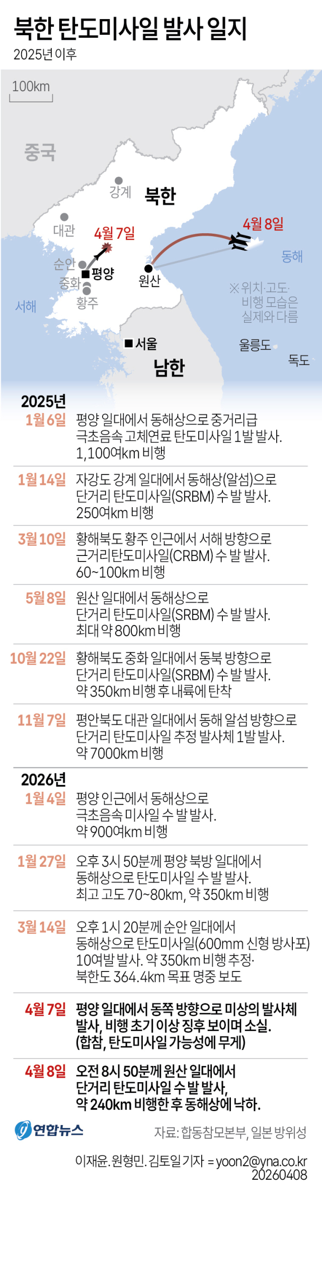 전날에 이어 이틀 연속 발사체를 쏜 것으로, 한미 정보당국은 세부 제원을 분석 중이다.