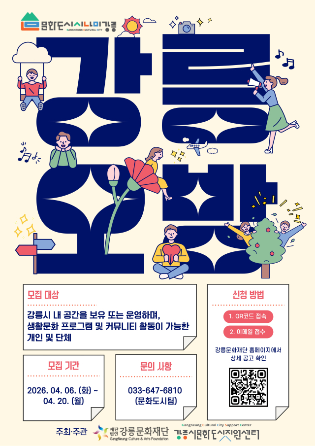선정된 참여자에게는 최대 500만원의 사업비가 지원되며, 신청은 강릉시문화도시지원센터 이메일(gnculture@naver.com)을 통해 접수할 수 있다. 자세한 사항은 강릉문화재단 홈페이지 공지사항을 참고하면 된다.