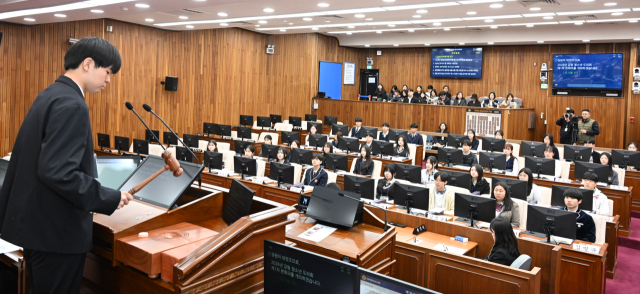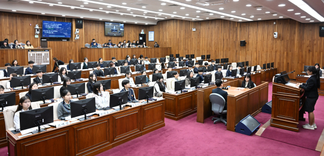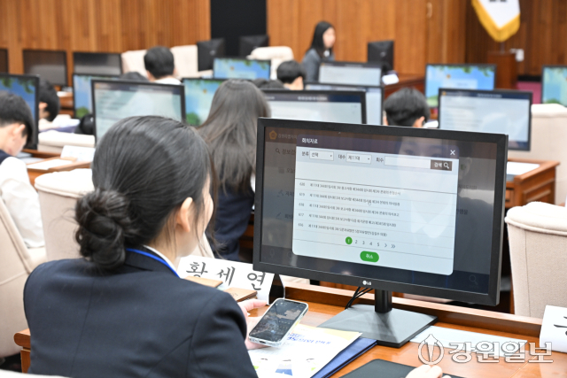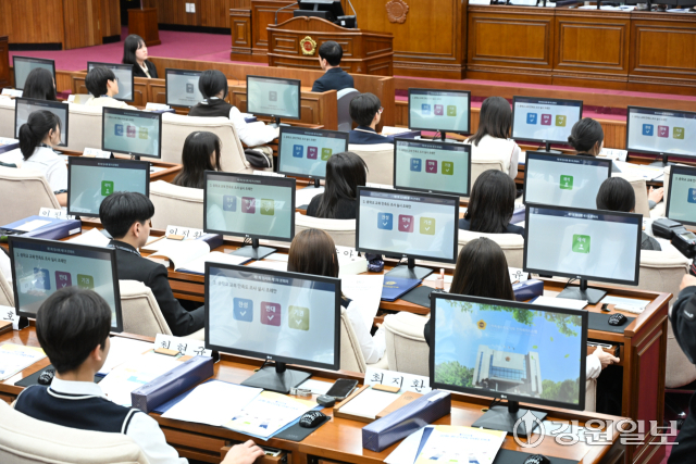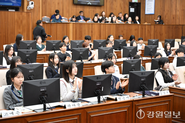 강원 청소년도의회는 도내 18개 시·군 중학생 50명이 참여해 의회 의사 운영 전 과정을 체험하는 행사로, 참여 학생들은 직접 도의회 본회의장 의석에 앉아 본회의 운영부터 조례안 및 결의안 발의, 찬반 토론, 3분 자유발언 등 실제 의정활동과 동일한 절차를 경험하는 시간을 가진다.