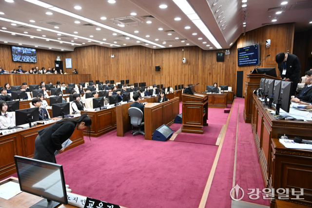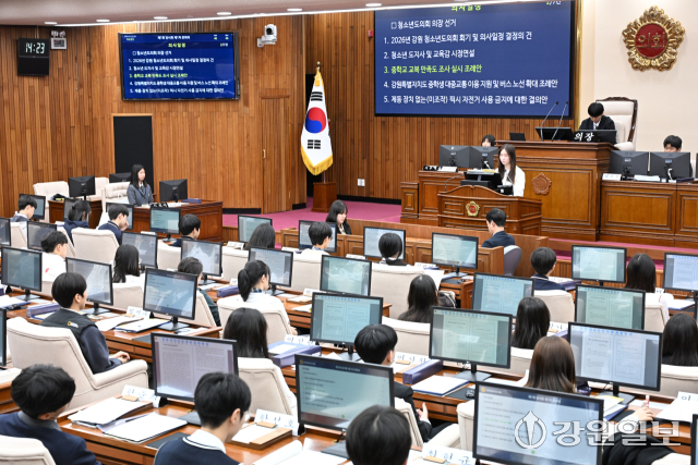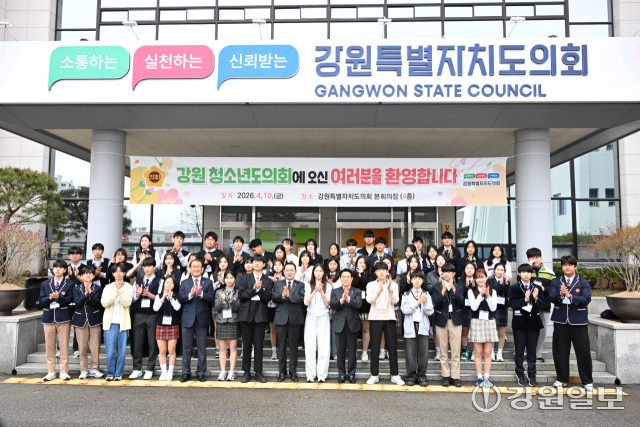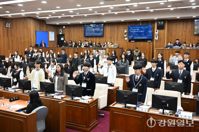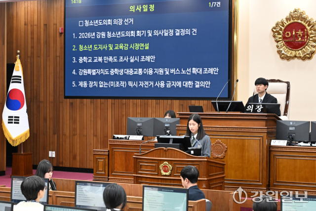 10일 강원자치도의회 본회의장에서 열린 2026 강원 청소년도의회에서 청소년 도의원들이 선서하고 있다. 이날 청소년 도의원들은 제1차 임시회 제1차 본회의를 열고 중학교 교복 만족도 조사 실시 조례안, 강원자치도 중학생 대중교통 이용 지원 및 버스 노선 확대 조례안 등의 안건들을 심의·의결했다. 신세희기자10일 강원자치도의회 본회의장에서 열린 2026 강원 청소년도의회에서 최지환 청소년 도의장이 본회의를 개의하며 의사봉을 치고 있다. 신세희기자10일 강원자치도의회 본회의장에서 열린 2026 강원 청소년도의회에서 윤서진 청소년 도지사가 시정연설하고 있다. 신세희기자10일 강원자치도의회 본회의장에서 열린 2026 강원 청소년도의회에서 노지민 청소년 교육감이 시정연설하고 있다.신세희기자10일 강원자치도의회 본회의장에서 열린 2026 강원 청소년도의회에서 청소년 도의원들이 청소년 도지사·교육감의 시정연설을 듣고 나서 박수치고 있다. 신세희기자10일 강원자치도의회 본회의장에서 열린 2026 강원 청소년도의회에서 시정연설 후 청소년 도의장과 청소년 교육감이 고개 숙여 인사하고 있다. 신세희기자10일 강원자치도의회 본회의장에서 열린 2026 강원 청소년도의회에서 이서윤 청소년 도의원이 중학교 교육 만족도 조사 실시 조례안을 발의하고 있다. 이날 청소년 도의원들은 제1차 임시회 제1차 본회의를 열고 중학교 교복 만족도 조사 실시 조례안, 강원자치도 중학생 대중교통 이용 지원 및 버스 노선 확대 조례안 등의 안건들을 심의·의결했다. 신세희기자10일 강원자치도의회 본회의장에서 열린 2026 강원 청소년도의회에서 청소년 도의원들이 '중학교 교복 만족도 조사 실시 조례안'에 대해 투표하고 있다. 이날 청소년 도의원들은 제1차 임시회 제1차 본회의를 열고 중학교 교복 만족도 조사 실시 조례안, 강원자치도 중학생 대중교통 이용 지원 및 버스 노선 확대 조례안 등의 안건들을 심의·의결했다. 신세희기자10일 강원자치도의회 본회의장에서 열린 2026 강원 청소년도의회에서 한 학생이 본회의 시작 전 회의자료를 보고 있다. 신세희기자10일 강원자치도의회 본회의장에서 열린 2026 강원 청소년도의회에서 한 학생이 기존의 도의회 344회 임시회 회의자료 목록을 보고 있다. 신세희기자2026 강원 청소년도의회가 10일 강원자치도의회 본회의장에서 도내 18개 시·군 중학생 50명이 참여한 가운데 열렸다. 이날 청소년 도의원들은 제1차 임시회 제1차 본회의를 열고 중학교 교복 만족도 조사 실시 조례안, 강원자치도 중학생 대중교통 이용 지원 및 버스 노선 확대 조례안 등의 안건들을 심의·의결했다. 신세희기자