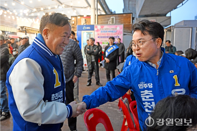 10일 춘천 풍물시장에서 열린 춘풍야장 개장식에서 더불어민주당 춘천시장 예비후보들인 육동한 시장(오른쪽)과 이재수 전 시장이 악수하고 있다.