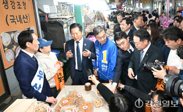 더불어민주당 정청래 대표가 11일 강릉시 중앙시장을 방문해 우상호 도지사 예비후보, 김중남 시장 예비후보를 지원하며 시민 관광객들에게 지지를 호소하고 있다.