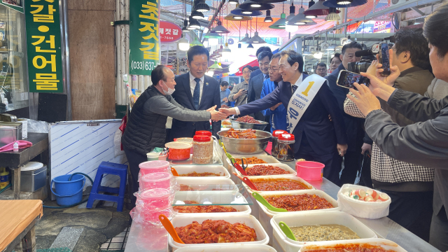 더불어민주당 정청래 대표가 12일 속초관광수산시장을 방문해 김도균 도당위원장, 우상호 도지사 예비후보, 김철수 속초시장 예비후보와 함께 상인들과 인사하고 있다. 속초=권원근기자
