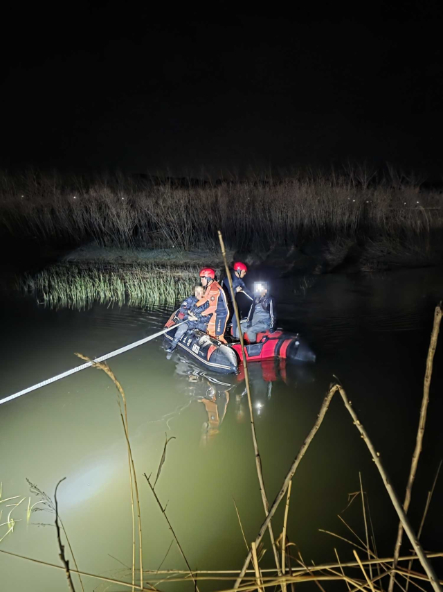 ◇지난 11일 밤 10시52분께 양양군 조산리 양양송이조각공원 파크골프장 인근 남대천에서 낚시객 2명이 고립돼 소방당국에 의해 구조됐다. 사진=강원특별자치도소방본부 제공