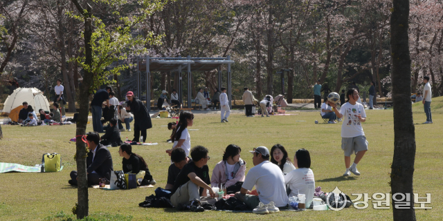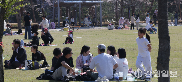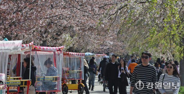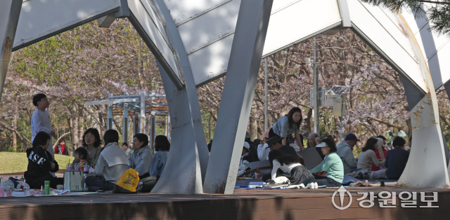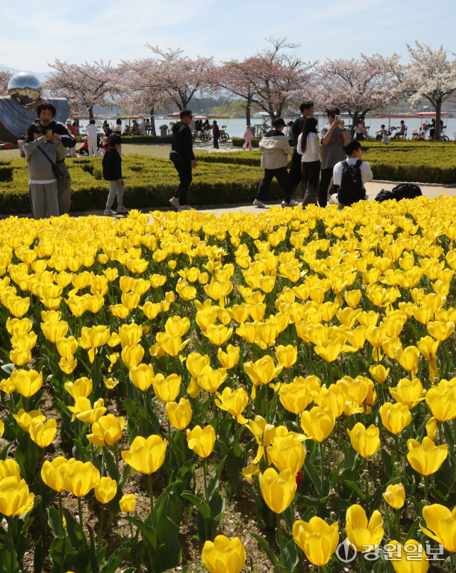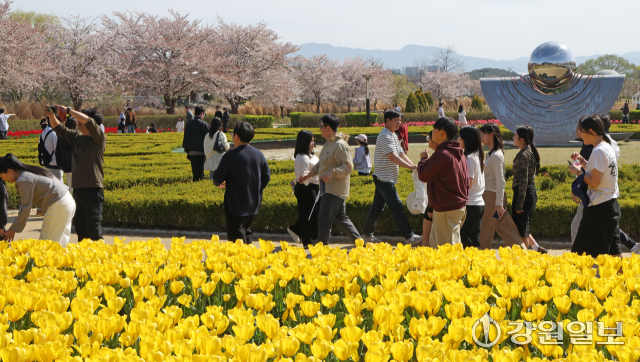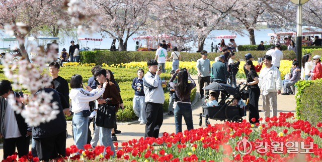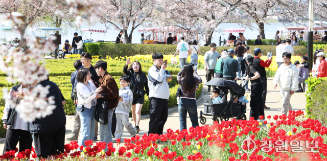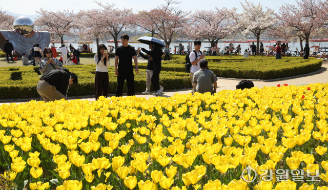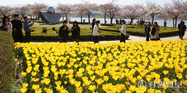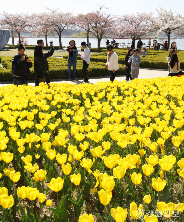 화창한 날씨를 보인 12일 강릉시 경포호 주변에서 관광객들이 만개한 튤립 꽃밭 속 추억을 남기며 봄의 낭만을 만끽하고 있다. 강릉=권태명기자