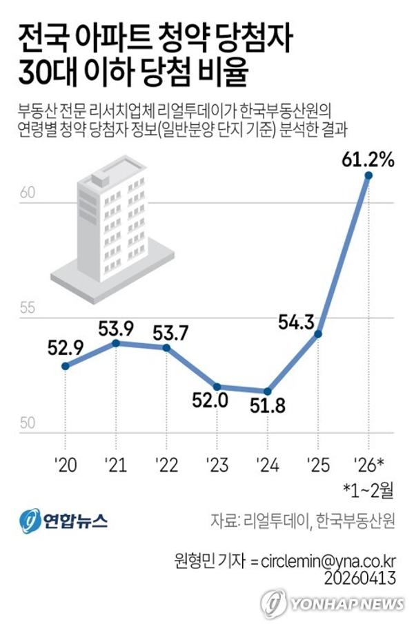 13일 부동산 전문 리서치업체 리얼투데이가 한국부동산원의 연령별 청약 당첨자 정보(일반분양 단지 기준)를 분석한 결과에 따르면 올해 1∼2월 전국 전체 청약 당첨자 7천365명 중 30대 이하는 61.2%(4천507명)으로 집계됐다.
