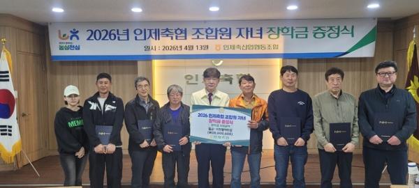 인제축협(조합장:조동환)은 13일 조합 대회의실에서 ‘2026년도 조합원자녀 장학금 전달식’을 갖고 축협조합원 자녀 14명에게 총 2,700만원의 장학금을 전달했다.