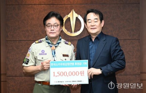 이날 강원일보 3층 회의실에서 열린 전달식에는 김학현 한국스카우트강원연맹 부연맹장과 박진오 함께사는 강원세상 이사장(강원일보 사장)이 참석했다.