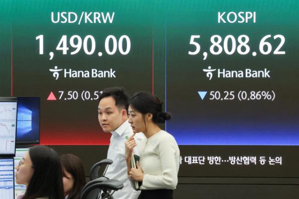 한국거래소에 따르면 이날 코스피는 전장보다 50.25포인트(0.86%) 내린 5,808.62로 거래를 마감했다.