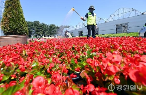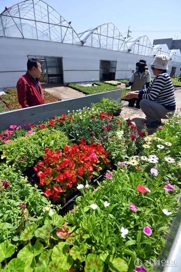 13일 춘천시 신북읍 꽃묘장에서 ‘시민 꽃 정원’ 조성을 위한 베고니아와 제라늄 등 꽃 모종 배부 작업이 진행되고 있다.
