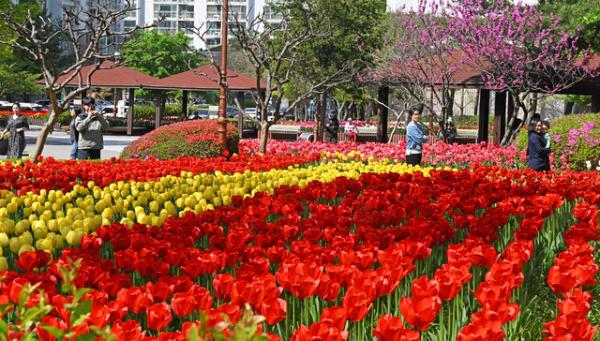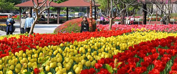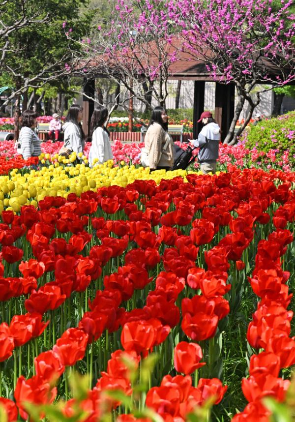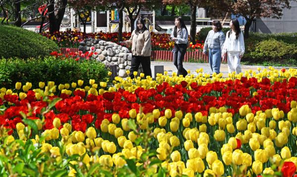 낮최고 기온이 20도를 웃돌며 초여름 날씨를 보인 13일 강릉시 교동 튤립공원에 형형색색의 튤립이 만개해 지나는 시민들의 눈길을 사로잡고 있다.