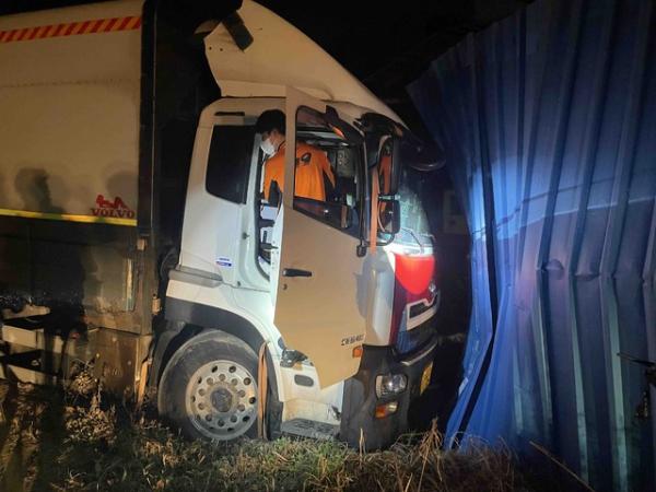 14일 새벽 2시28분께 원주시 호저면에서 11톤 화물차량이 도로 옆 철판벽을 들이받았다.