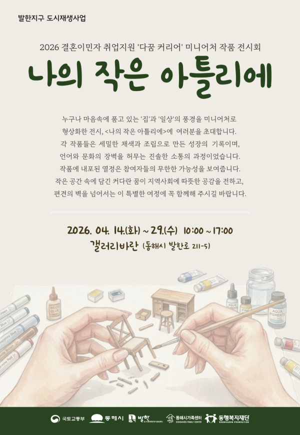 동해시가족센터(센터장:우미강)가 동행복지재단 지원으로 개최하는 이번 전시는 결혼이민자들이 전문적인 공예 기술을 습득하여 ‘미니어처 지도사’로서 사회에 진출하고 경제적 자립 기반을 마련할 수 있도록 기획된 프로그램의 중간 결실을 선보이는 자리다.