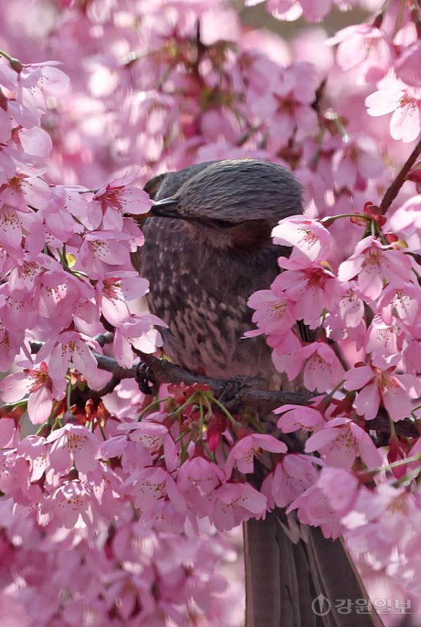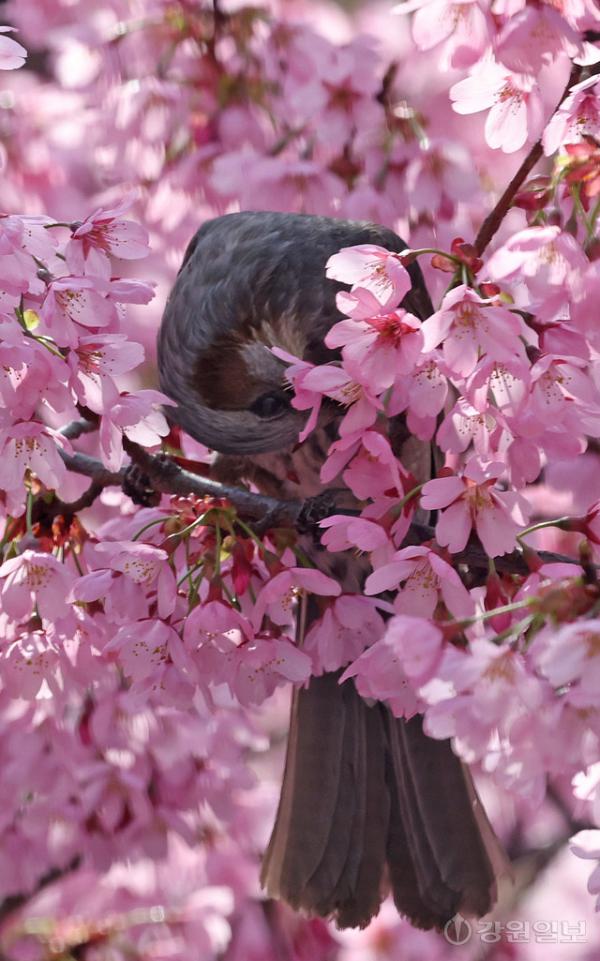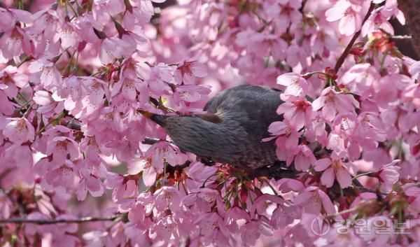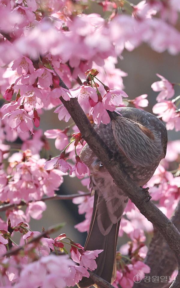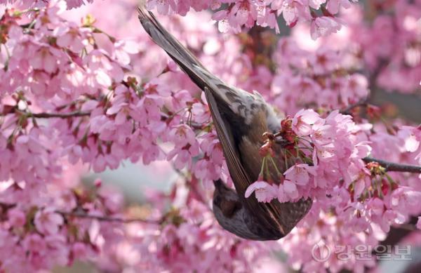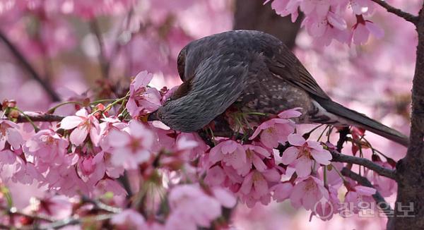 봄이 한창인 14일 강릉시내 벚나무에서 직박구리가 벚꽃을 따서 꿀을 빨고 있다.