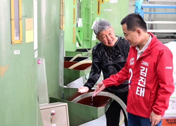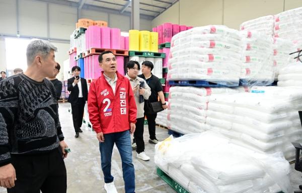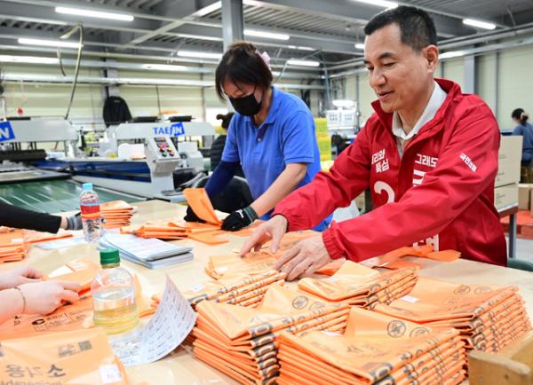 김진태 국민의힘 도지사 후보가 14일 춘천의 종량제봉투 제조공장에 방문해 봉투 제조 과정에 대한 설명을 듣고, 봉투 포장 작업을 하며 근로자들과 이야기를 나눴다.