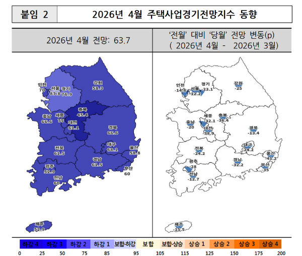이에 대해 주산연은 미국·이란 전쟁 여파로 인한 경기 둔화 우려, 유가 상승에 따른 건설원가 상승, 최근 금리 상승 추세에 따른 수요위축 우려에 따른 것으로 봤다. 아울러 정부가 6.3 지방선거 이후 강력한 보유세 강화대책 등을 예고하면서 주택 매수심리가 악화될 것이라는 우려도 영향을 미친 것으로 분석했다.