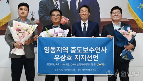 김진기 전 속초시의회 의장, 최령근 전 속초시의원, 박영곤 전 한국자유총연맹 속초시지회장은 14일 우상호 더불어민주당 강원도지사 예비후보 선거 캠프를 찾아 우 후보에에게 강원 영동지역 전직 의장단과 보수진영 인사 1,000명의 지지선언 명단을 전달했다.
