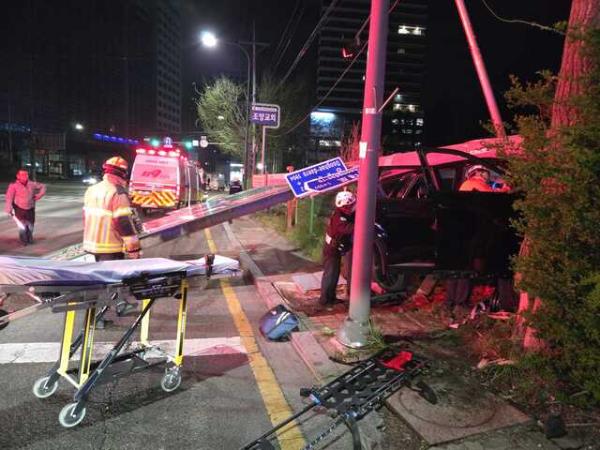15일 새벽 3시14분께 속초시 조양동의 한 교차로 인근 도로에서 A(31)씨가 몰던 SUV가 도로 이정표를 들이받고 인도로 돌진했다.