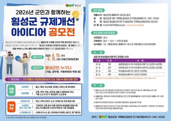 군은 일상생활과 생업현장에서 겪고 있는 각종 불합리한 규제를 개선하기 위해 군민과 함께하는 ‘2026년 횡성군 규제개선 아이디어 공모전’을 개최한다고 15일 밝혔다. 이번 공모전은 생활 속 불편사항을 발굴하고 개선방안을 제안함으로써 군민이 체감할 수 있는 규제혁신을 추진하기 위해 마련됐다.