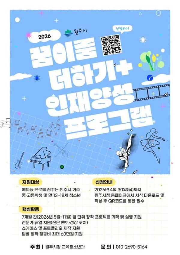 대상은 원주시에 주민등록을 두고 음악·미술·디자인·무용·체육 등 예체능 분야 진로를 희망하는 중·고교생 및 13~18세 학교 밖 청소년이다. 팀당 2∼5명 총 6개 팀을 선발하며 개인으로 신청하더라도 관심 분야가 비슷한 다른 신청자와 팀 매칭이 이뤄질 수 있다. 신청은 시 홈페이지에 게시된 링크 또는 QR코드로 하면 된다. 김설영기자 snow0@kwnews.co.kr