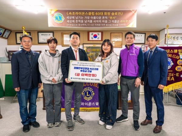 국제라이온스협회 354-E(강원)지구 속초라이온스클럽(회장:전유현)은 지난 14일 전국장애인부모연대 속초시지회에 지역 내 장애인과 그 가족들의 삶의 질 향상과 복지 증진을 위한 후원금을 전달했다.