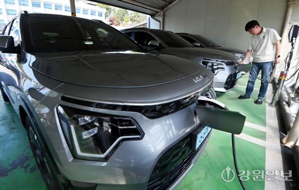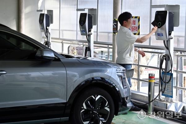 정부가 주말과 공휴일 낮 시간대 전기차 충전요금을 할인 적용키로 한 가운데 15일 춘천의 한 전기차 충전소에서 시민이 전기차를 충전하고 있다.