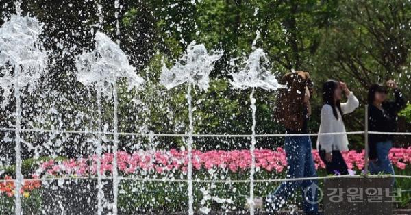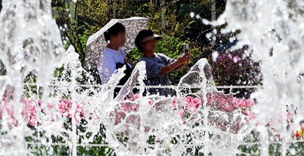 춘천 낮 최고기온이 28도까지 오르며 초여름 날씨를 보인 15일 강원자치도립화목원에서 시민들이 각양각색의 방법으로 따가운 햇살을 피하고 있다.