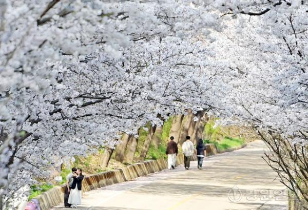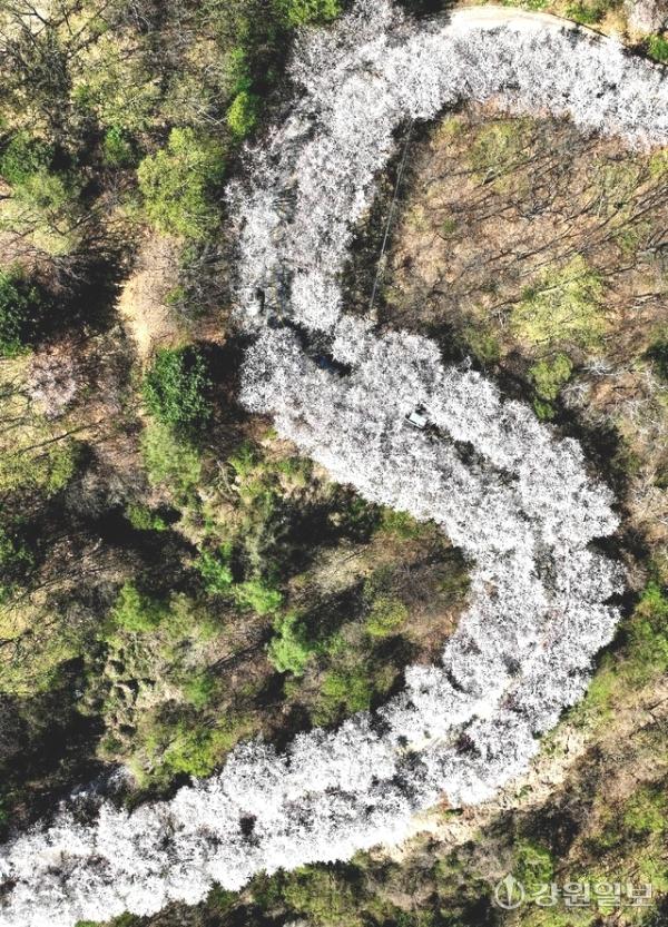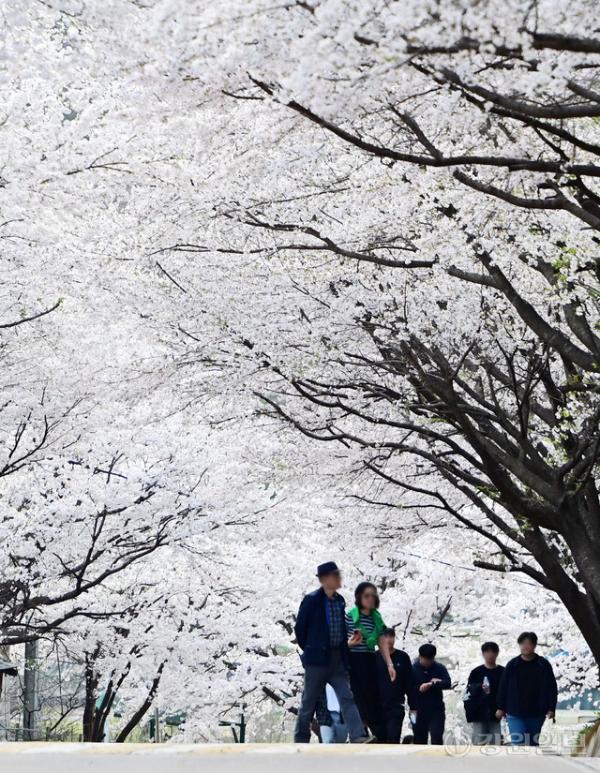 15일 춘천시 북산면 부귀리에 벚꽃이 만개해 상춘객들이 봄의 끝자락을 만끽하고 있다.