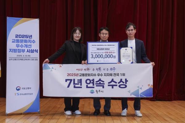 원주시는 16일 경북 상주시 한국교통안전공단 교통안전체험교육센터에서 열린 ‘2025 교통문화지수 우수 및 개선 지자체 시상식’에서 인구 30만 이상 시 부문 1위를 차지, 국토교통부 장관상을 받았다. 7년 연속 1위 기록을 이어간 쾌거다.