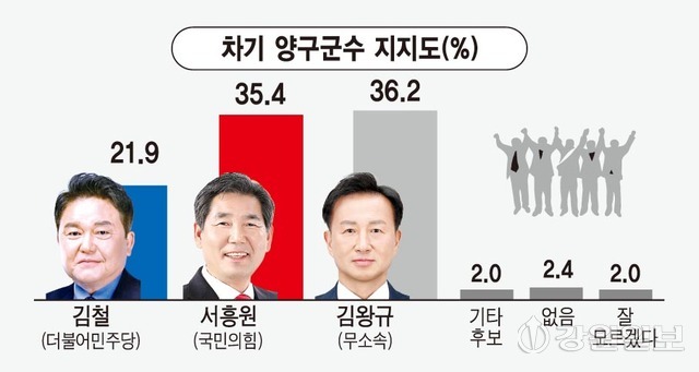 강원일보가 여론조사 전문기관 (주)에이스리서치에 의뢰해 지난 13~14일 양구군에 거주하는 만 18세 남여 504명을 대상으로 차기 양구군수 후보 지지도를 물은 결과(95% 신뢰수준에 표본오차 ±4.4%포인트) 무소속 김왕규 후보가 36.2%로 국민의힘 서흥원 후보 35.4%를 오차범위 내인 0.8%포인트 앞섰다. 더불어민주당 김철 후보는 21.9%를 기록, 김왕규·서흥원 후보와 각각 14.3%포인트, 13.5%포인트씩 오차범위 밖 격차를 보였다.