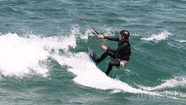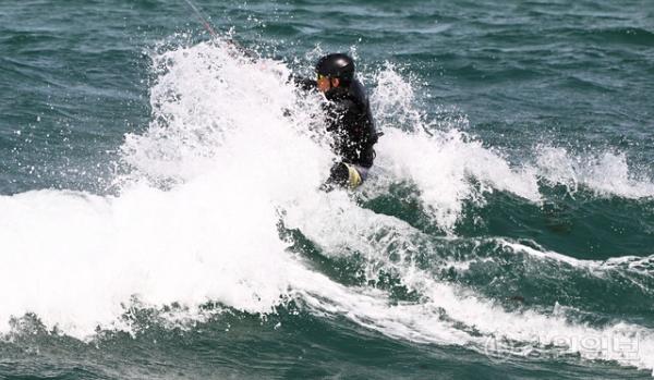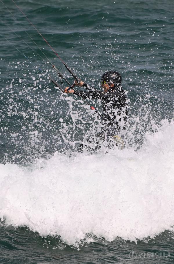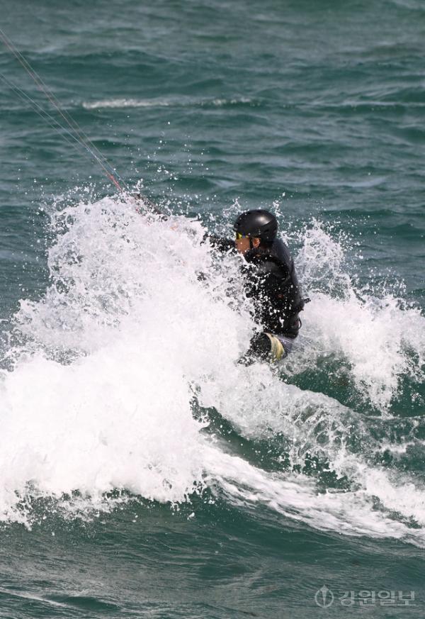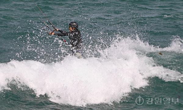 전국적으로 초여름 날씨를 보인 16일 강릉 송정해변에서 카이트 서퍼가 바람에 몸을 맞기며 파도를 타며 카이트 서핑을 즐기고 있다. 권태명 기자 kwon@kwnews.co.kr