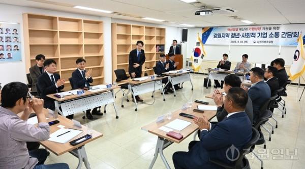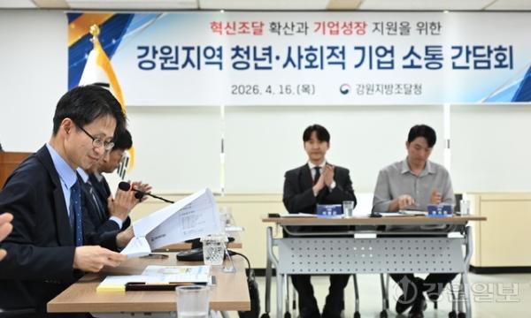 혁신조달 확산과 기업성장 지원을 위한 강원지역 청년·사회적 기업 소통 간담회가 16일 강원지방조달청에서 백승보 조달청장, 강구형 강원지방조달청장과 기업 대표들이 참석한 가운데 열렸다.