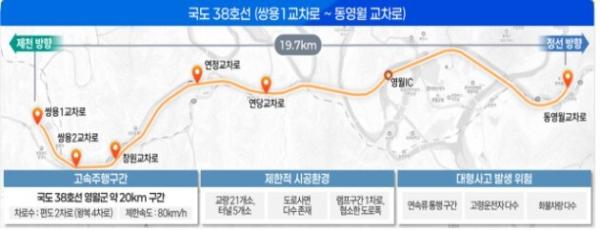 사업구간은 국도38호선 자동차전용도로(쌍용1교차로~동영월교차로) 19.7㎞ 내 교차로 6곳이다. 각 교차로마다 역주행 차량의 진입을 방지하는 물리적 차단기와 역주행 발생 정보를 제공하는 도로전광판(VMS)를 설치해 역주행 사고를 사전 예방할 수 있도록 했다.