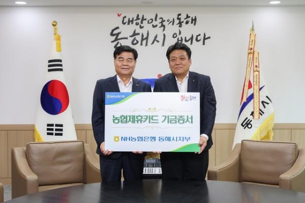 NH농협은행 동해시지부(지부장:최종웅)는 지난 17일 동해시청을 방문, 지난 해 동해시청 법인 및 보조금 등 각종 카드 이용 실적에 따라 일정 비율로 적립된 농협 제휴카드 적립 기금 6,083만원을 심규언 시장에게 전달했다.