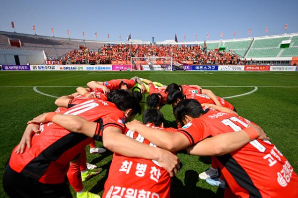 ◇18일 강릉하이원아레나에서 열린 ‘하나은행 K리그1 2026’ 8라운드 강원FC와 전북현대의 경기에 앞서 강원 선수들이 승리를 다짐하고 있다. 사진=강원FC 제공.