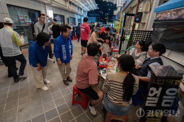 ◇육동한 더불어민주당 춘천시장 예비후보는 18일 ‘토요 번개 야시장’ 개장식에 참석해 시민들과 만났다.