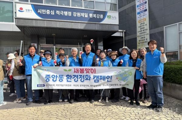 강릉시 중앙동은 19일 중앙동 일원에서 중앙동주민자치회와 통장협의회를 비롯해 새마을협의회, 새마을부녀회, 바르게살기협의회, 방위협의회, 자율방범대 등 자생 단체 회원 100여 명이 참여해‘새봄맞이 중앙동 환경정화 캠페인’을 실시했다.