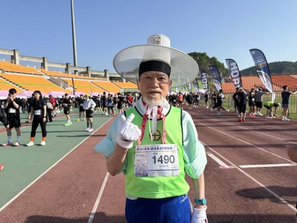 ◇갓차림으로 트랙에 선 이색 참가자도 대회장의 시선을 한몸에 받아. 이득우(81)씨는 직접 준비한 안내문을 통해 강원특별자치도 출범 3주년과 시정 방침 실현을 기리며 대회에 참가했다고 소개. 특히 춘천대첩과 참전 16개국, 전국 각지의 순국선열을 추모하는 뜻도 함께 담았다고 밝혀 눈길. 10㎞ 1회, 30㎞ 1회, 하프 23회, 풀코스 56회 등을 완주한 실력자. 강원일보 창간 81주년에 맞춰 자신 역시 올해 81세라고 밝히기도.
