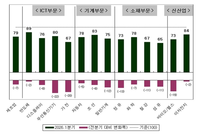 한편, 1분기 제조업 매출 현황 BSI는 79로 전 분기보다 7포인트 하락했다. 철강(67·-11포인트), 섬유(65·-11포인트) 등 소재 부문 업종을 중심으로 부진세가 이어졌고, 무선통신기기(80·-22포인트), 가전(67·-20포인트), 바이오ㆍ헬스(73·-19포인트), 정유(73·-13포인트), 일반기계(75·-12포인트), 철강(67·-11포인트), 섬유(65·-11포인트) 등 대부분 업종이 하락했다.