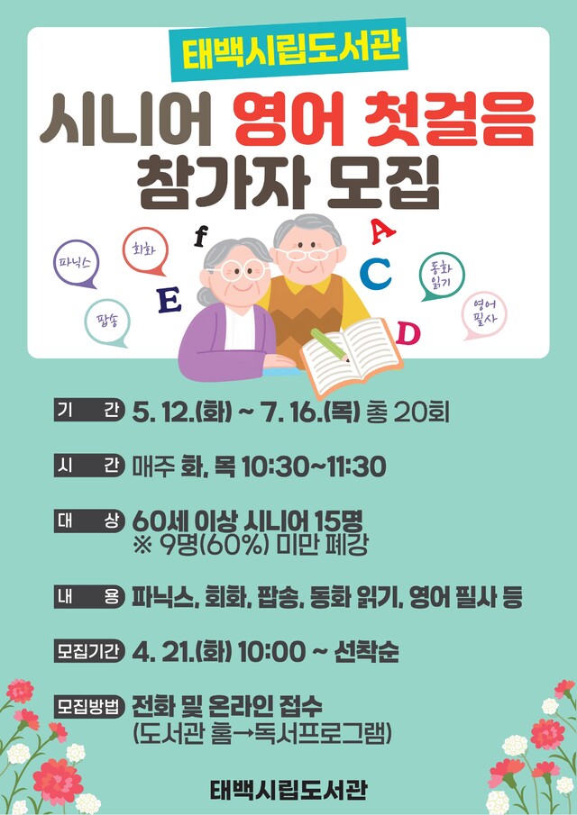【태백】태백시는 60세 이상 시니어를 대상으로 다음달 12일부터 7월 16일까지 ‘시니어 영어 첫걸음’ 프로그램을 운영한다.