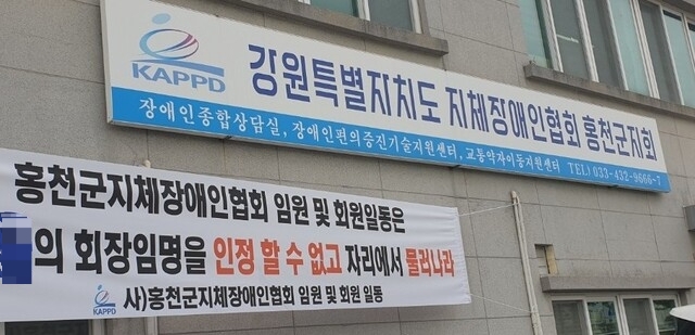 【홍천】홍천군지체장애인협회가 신임 지회장 임명에 반대하며 20일 강원도지체장애인협회를 항의 방문했다.