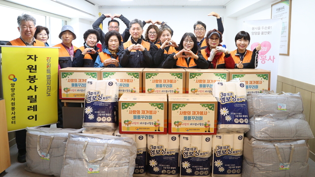 양양군자원봉사센터는 21일 양양자원봉사대와 함께 센터 회의실에서 사랑의 재가봉사 생필품 꾸러미 전달식을 갖고 지역 내 취약계층 생필품과 식료품 등 생활에 필요한 물품으로 구성된 꾸러미를 전달했다.