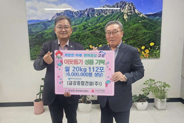 금강종합건설㈜은 22일 토성면 행정복지센터에서 아야진경로당과 청간경로당, 저소득 취약계층, 토성면지역사회보장협의체를 위해 600만원 상당의 쌀 20㎏ 112포를 기탁했다.