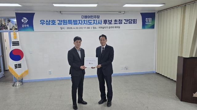 ◇더불어민주당 우상호 강원특별자치도지사 예비후보가 22일 정선 사북읍 지역살리기 공추위 회의실에서 열린 후보 초청 간담회에 참석한 가운데 안승재 지역살리기 공추위원장이 우 예비후보에게 지역 건의서를 전달했다.