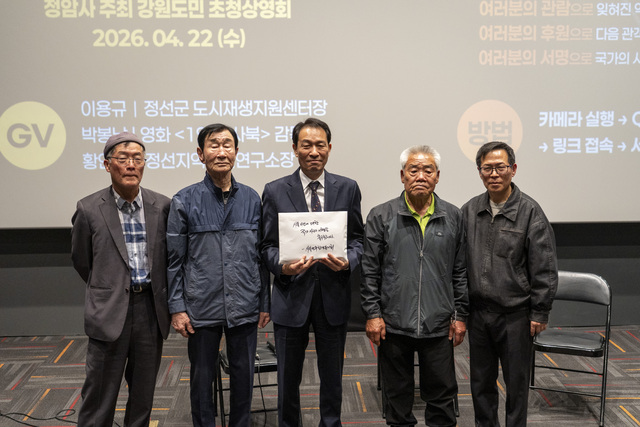 ◇우상호 강원지사 후보가 22일 정선 고한시네마에서 영화 ‘1980 사북’을 관람, 박봉남 감독, 황인욱 정선지역사회연구소장 등과 함께 ‘관객과의 대화(GV)’ 시간을 가졌다.