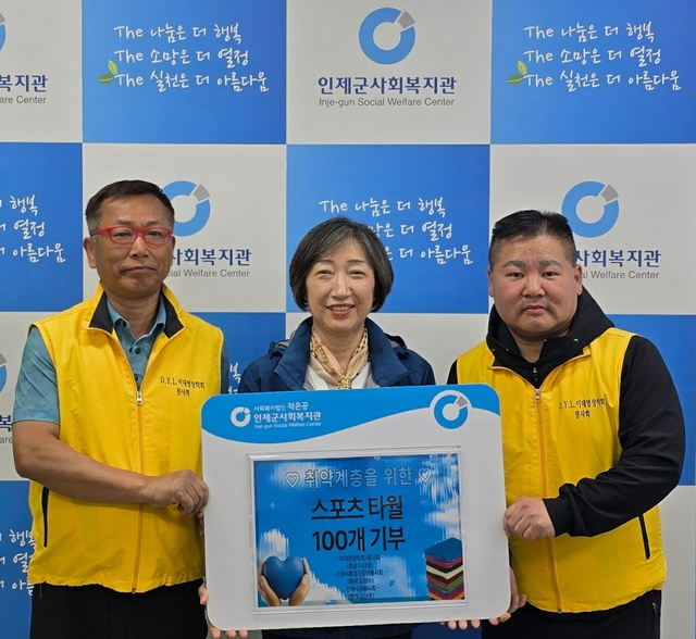 이대영장학회/봉사회(회장:이대영)와 1004환경지킴이봉사회(회장:김양수)는 23일 인제군사회복지관(관장:한성은)을 방문, 취약계층을 위한 ‘사랑의 스포츠 타월’ 100개를 전달했다.